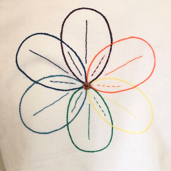 Tote bag doublé, confectionné dans une nappe en lin et brodé à la main. Un bouton en bois peint orne le centre du motif.