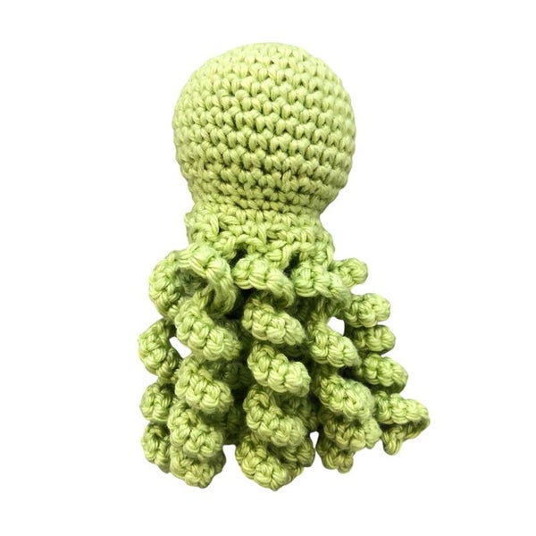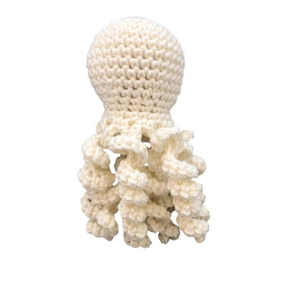 Crochetées en coton certifié Oeko-Tex, ces petites pieuvres aux couleurs vives stimuleront les sens de bébé, et en manipulant les tentacules il développera sa motricité.