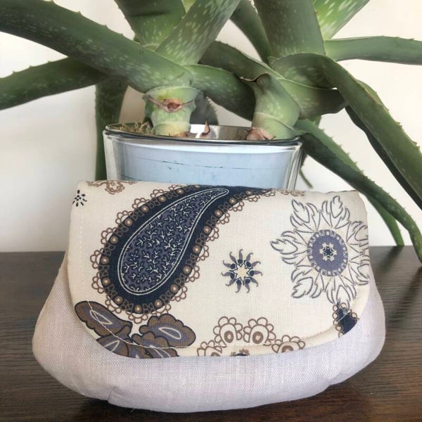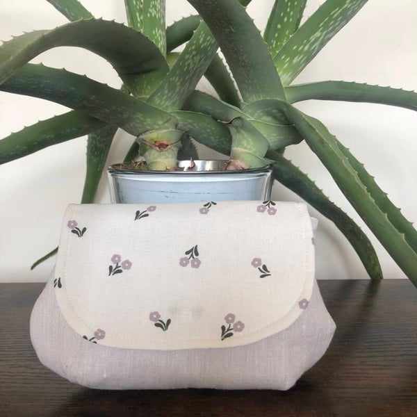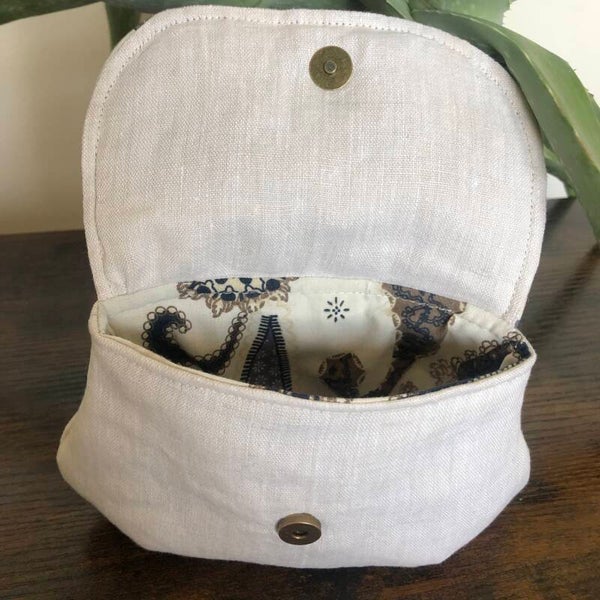 Petite pochette molletonnée en lin uni et coton imprimé. Fermeture par pression magnétique.