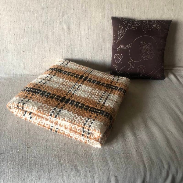 Plaid Tartan fait main, mêlant crochet et tissage, idéal pour les moments cocooning.